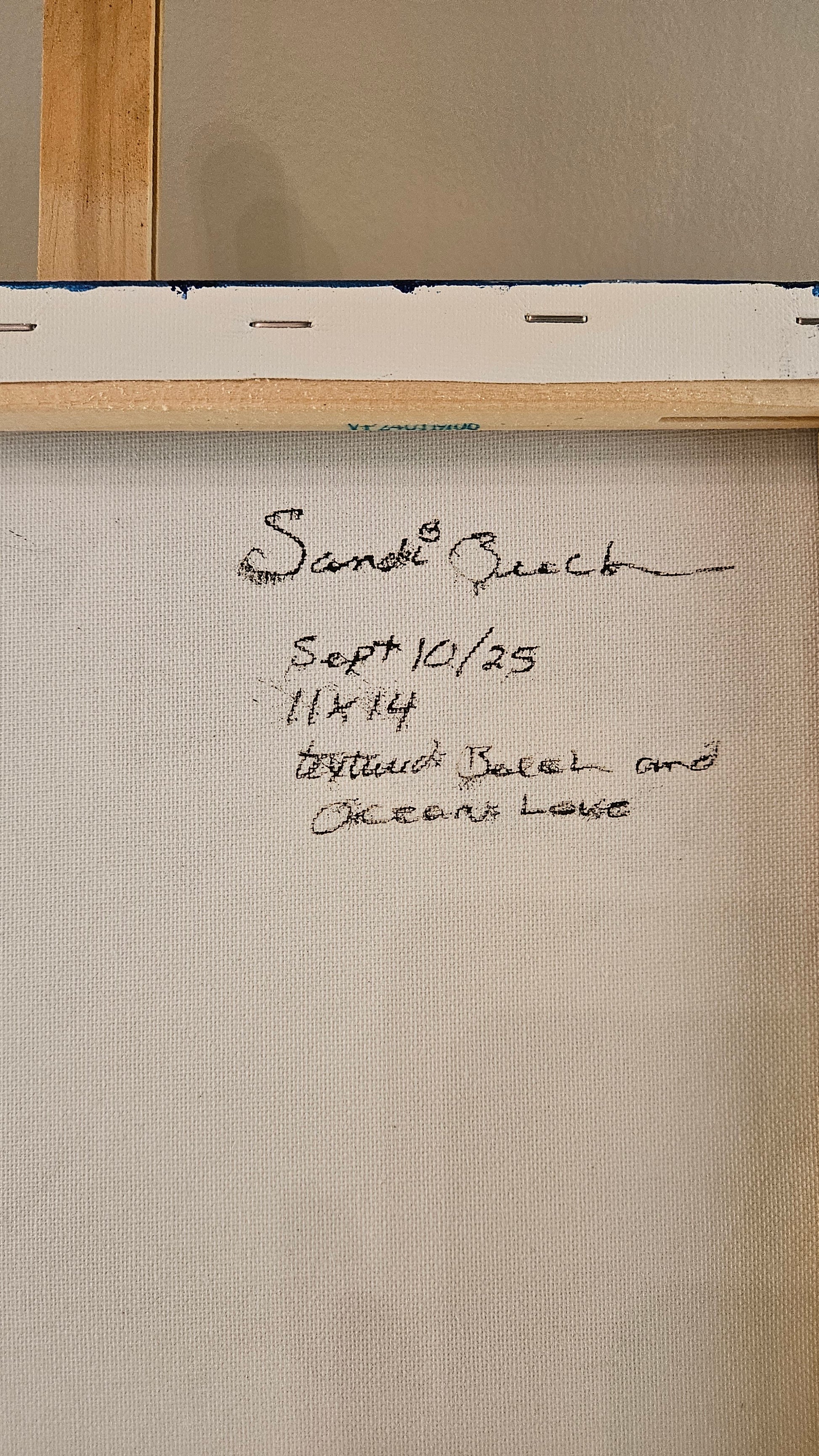 This is a medium piece that enraptures the ebb and flows of the ocean kissing the Beach. This piece has an epoxy coating over REAL sand. The size is 11"x14"